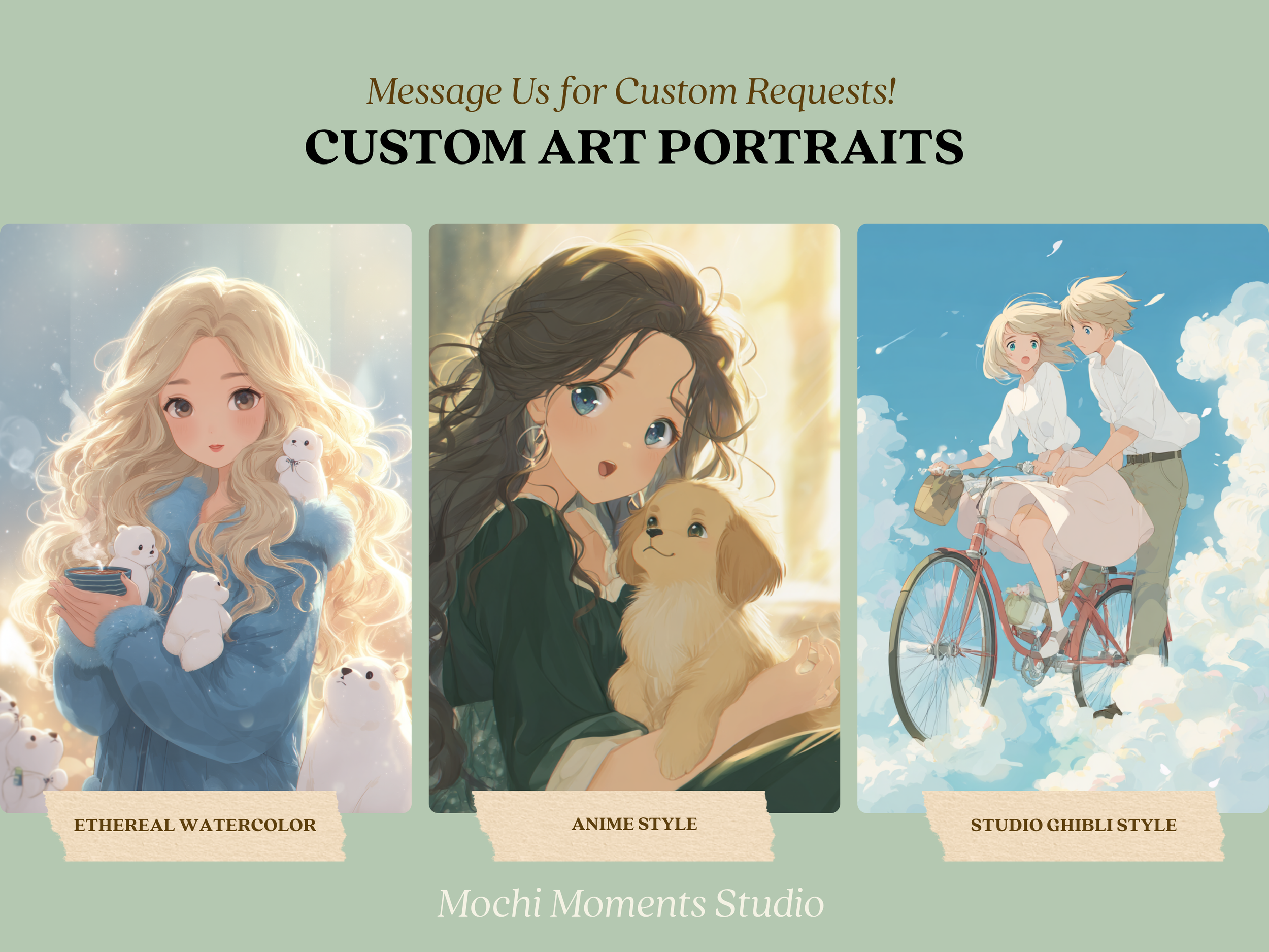Hi! I’m the artist behind Mochi Moments Studio — I create dreamy custom portraits inspired by anime, fairytales, and magical companion adventures.